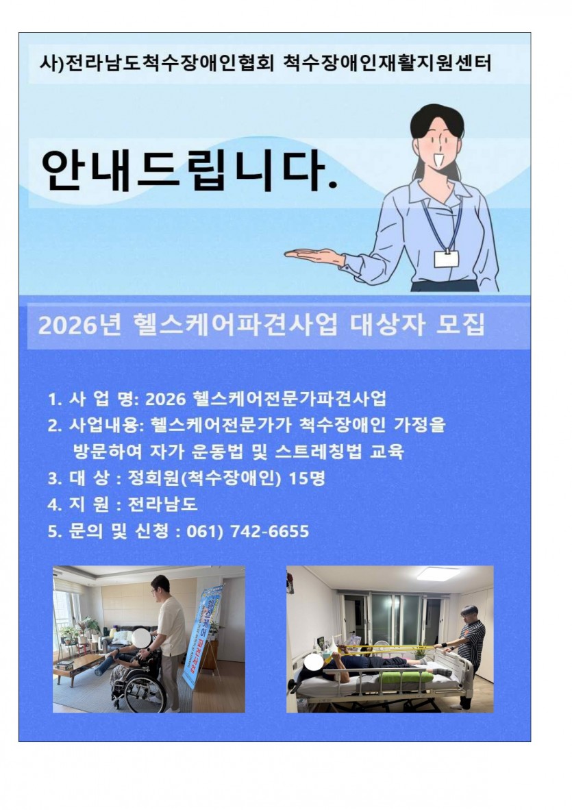 2026년 헬스케어전문가 파견사업 대상자 모집 작성자 정보 전라남도척수장애인협회 작성 작성일 2026.02.19 11:29 컨텐츠 정보 55 조회 목록 답변 본문 2026년 헬스케어파견사업 대상자 모집 1. 사업명: 헬스케어전문가파견사업 2. 사업내용: 헬스케어 전문가가 척수장애인 가정에 방문하여 자가 운동법 및 스트레칭법 교육 3. 대상: 정회원(척수장애인) 15명 4. 지원: 전라남도 5. 문의 및 신청: 061)742-6655 한국척수장애인협회 전라남도협회 전라남도척수장애인재활지원센터 관련자료 다음 제10기 시․도 협회장 정기모집 공고 작성일 2026.02.09 16:45 댓글 0개 등록된 댓글이 없습니다. Select File Upload File 목록 답변